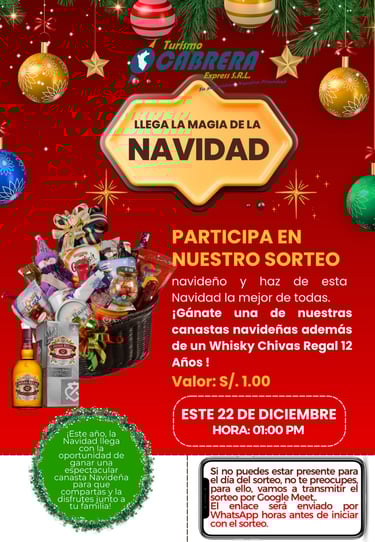 Turismo Cabrera Express te invita a participar en nuestro Gran Sorteo Navideño, pensado especialmente para ti y tu familia. Viaja seguro, cómodo y confiable estas fiestas, y además participa por increíbles premios solo por elegirnos. Porque en Navidad, queremos llevarte no solo a tu destino, sino también la alegría de ganar.