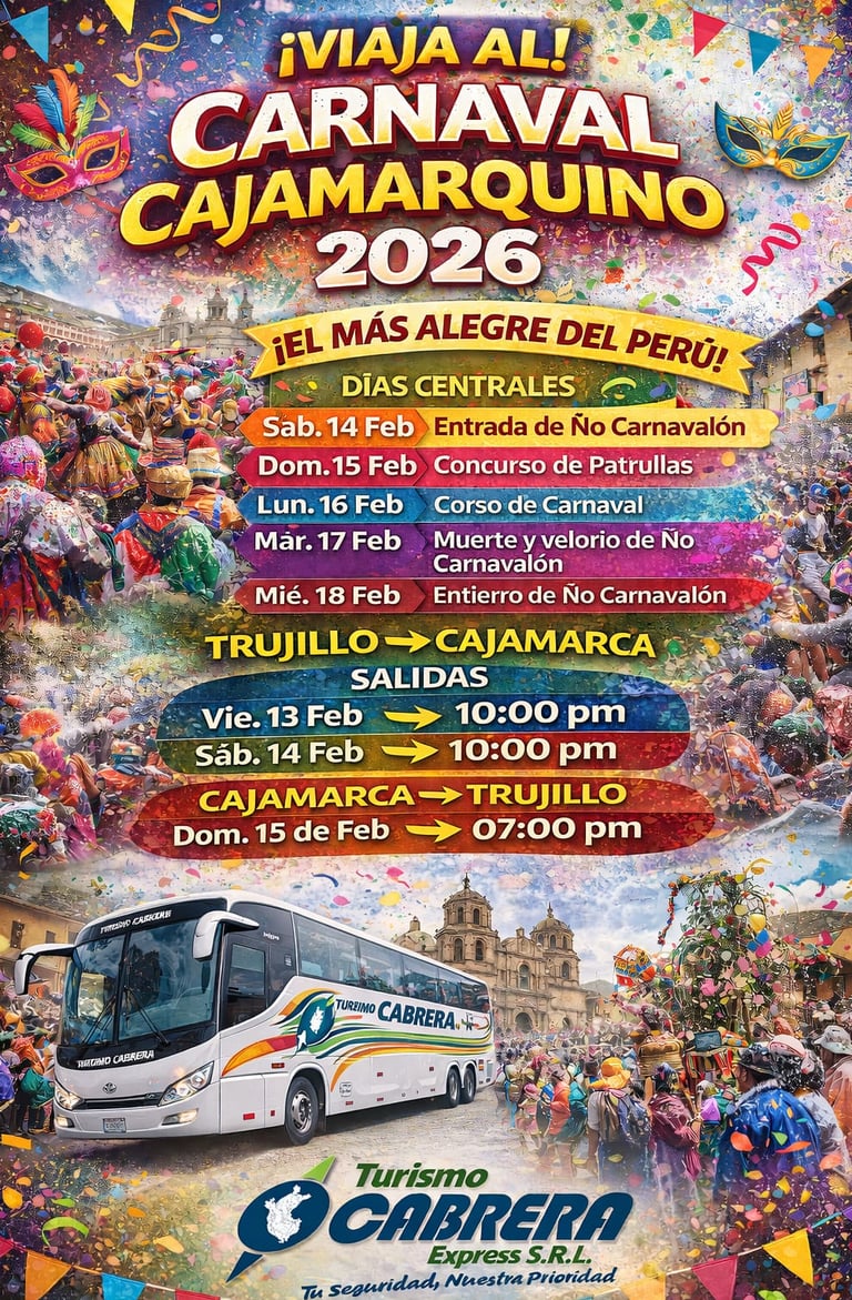 TURISMO CABRERA EXPRESS TE INVITA A VivIR la fiesta, el color y la tradición del Carnaval Cajamarquino 2026 viajando con la seguridad y comodidad que solo Turismo Cabrera Express te ofrece 💨.